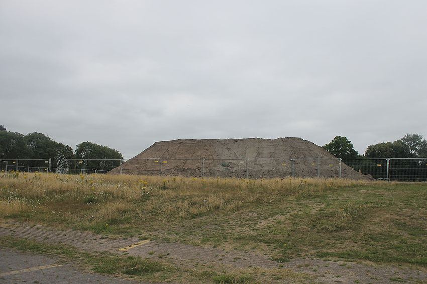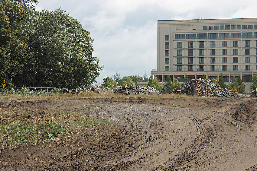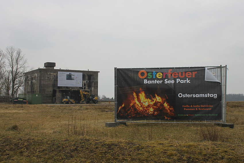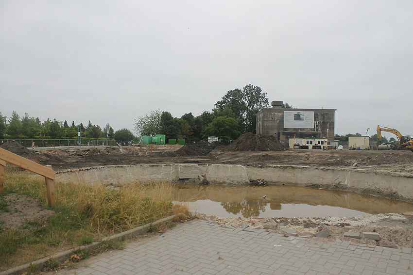 Mittlerweile wurde auch der Gehweg an der Jadeallee abgezäunt. Weitere Mengen Erdreich wurden nordöstlich des Bunkers ausgehoben. Der Tankfundamentbereich ist voll Wasser gelaufen. Es wird sich hierbei um Grund- und Regenwasser handeln.
