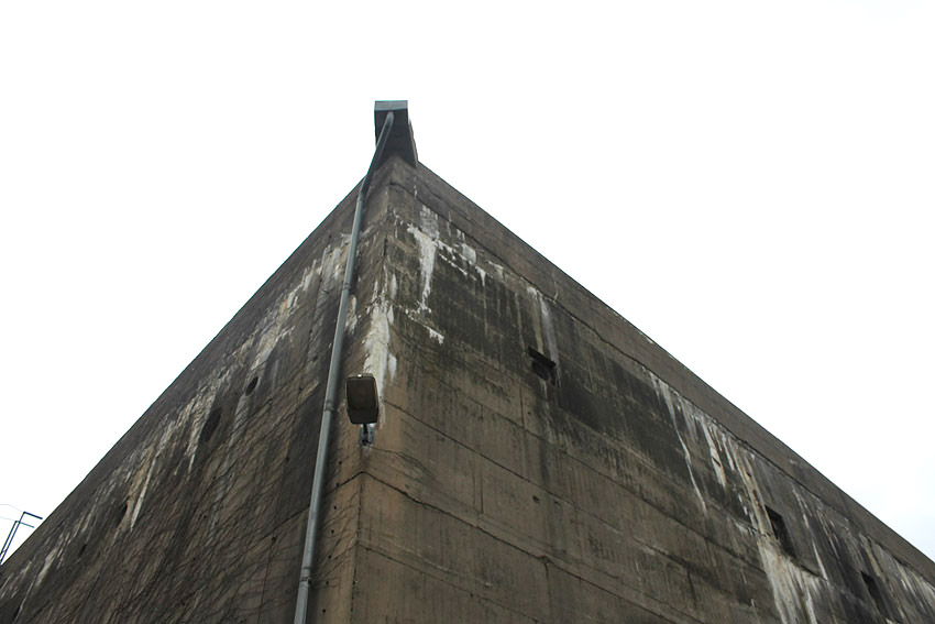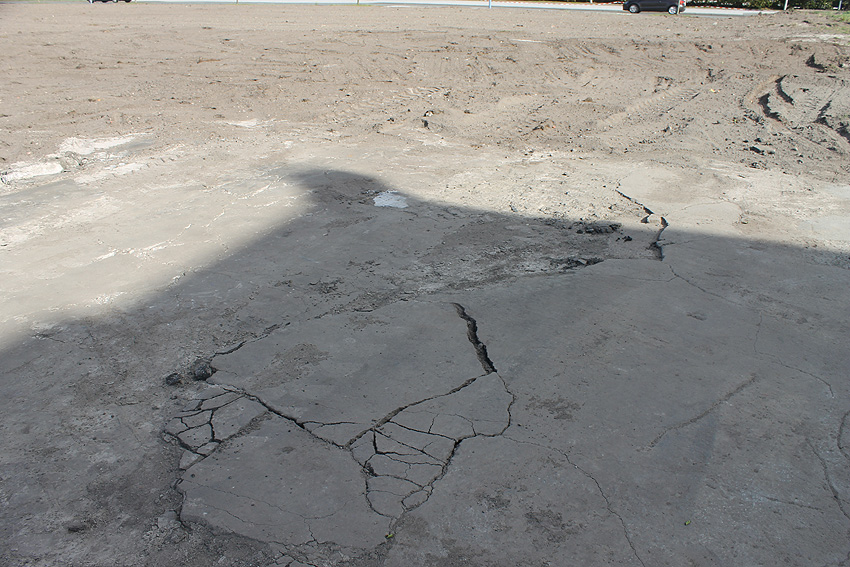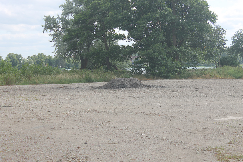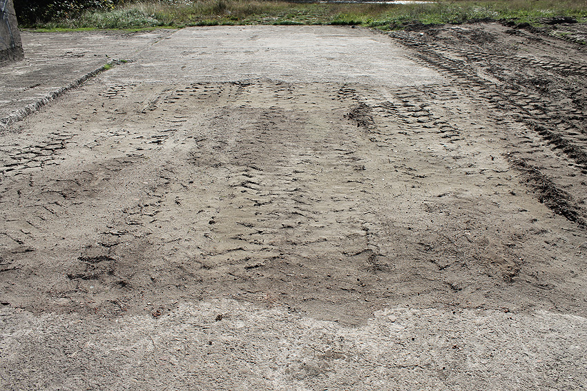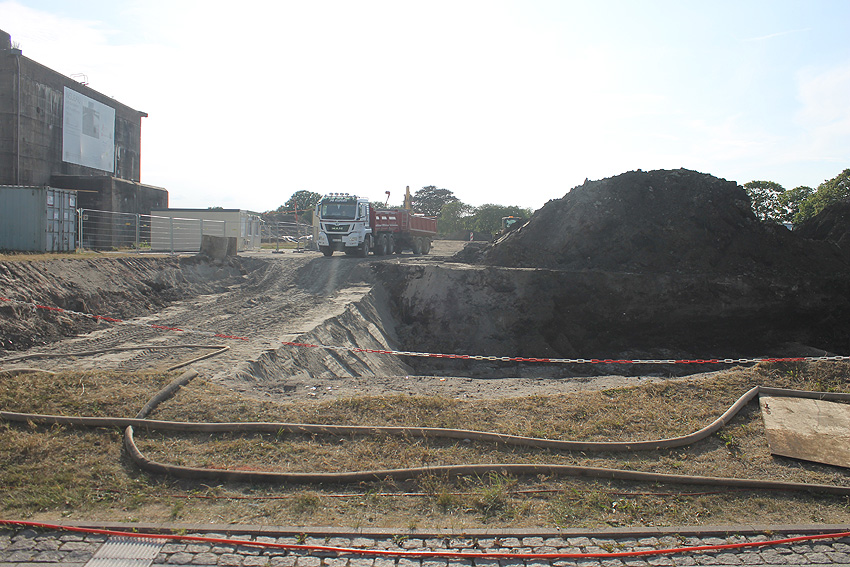 Im westlichen Bereich der Zerschellerplatte des T 750 wurde ein Teilstück weggebrochen und ein "Tunnel" bis etwa einen Meter unter das eigentliche Bunkerfundament getrieben. Hiermit sollte festgestellt werden, auf wieviel Pfählen der Bunker gegründet ist. Die Freilegung von zwei Pfählen reichte dafür wohl zur Berechnung aus. Die Maßnahme soll nach unseren Informationen nötig gewesen sein, um Statikwerte bezüglich des geplanten Überbaues des T 750 zu berechnen. Nach etwa einer Woche wurde die Öffnung dann wieder verfüllt und die zerstörte Zerschellerplatte in dem Bereich neu mit Betonschlemme ausgefüllt. Die eigentlichen Sanierungsarbeiten auf dem Gelände "wandern" nun weiter in Richtung Westen in etwa abschließend mit der westlichen Bunkerwand. Im Oktober sollen die Arbeiten abgeschlossen sein. Auch die verbliebene Fundament-Sohlplatte des Öltanks "Grodenfähre Nord" wurde mittlerweile zerkleinert und abgetragen.