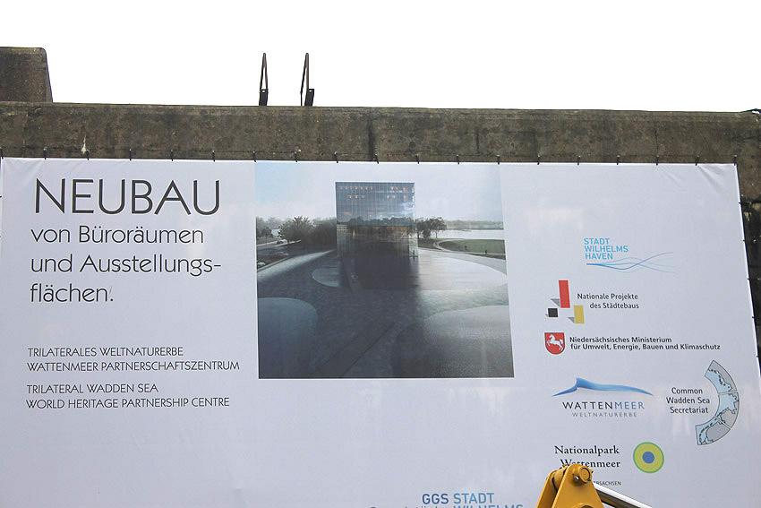 Gestern, am 23. März 2018 fand der symbolische erste Spatenstich zum Bau des "Trilateralen Weltnaturerbe Wattenmeer-Partnerschaftszentrums" statt. Ein großformatiges Plakat wurde an die Nordwand des Bunkers gehängt. Baumaschinen stehen bereit. Zunächst wird nun damit begonnen, das umliegende / anliegende Gebiet zu sondieren und von Altlasten zu befreien. Auch nach Kampfmitteln wird gesucht.